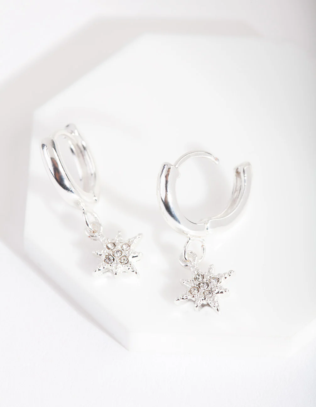 Stack up the style with these huggie earrings! This pair features a silver-toned diamante embellished star charm design. Wear them on their own for an elegant look, or incorporate them into an ear stack for maximum impact!