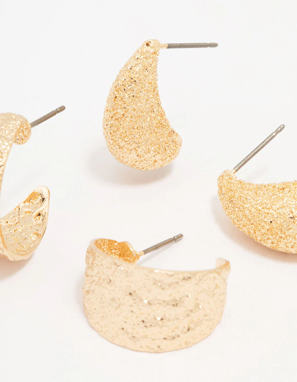 For a timeless addition to your look, style these gorgeous gold-toned earrings. This earring pack contains a pair of bold textured hoops and adorning teardrop earrings, perfect for mixing up your stack!
